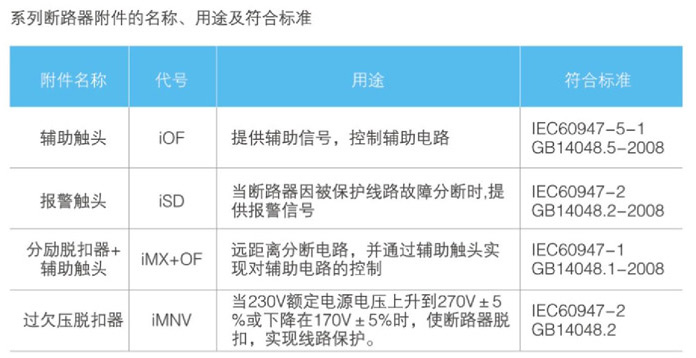 本系列断路器附件是我公司专为iC65系列断路器配套设计的辅助功能元件,在家居、建筑等电气线路中,根据需要选择不同的电气附件与iC65断路器配合,以实现断路器因被保护线路故障的远程脱扣控制、提供辅助信号、分合状态指示、提供报警信号功能,更好地保护线路、人身和财产安全。