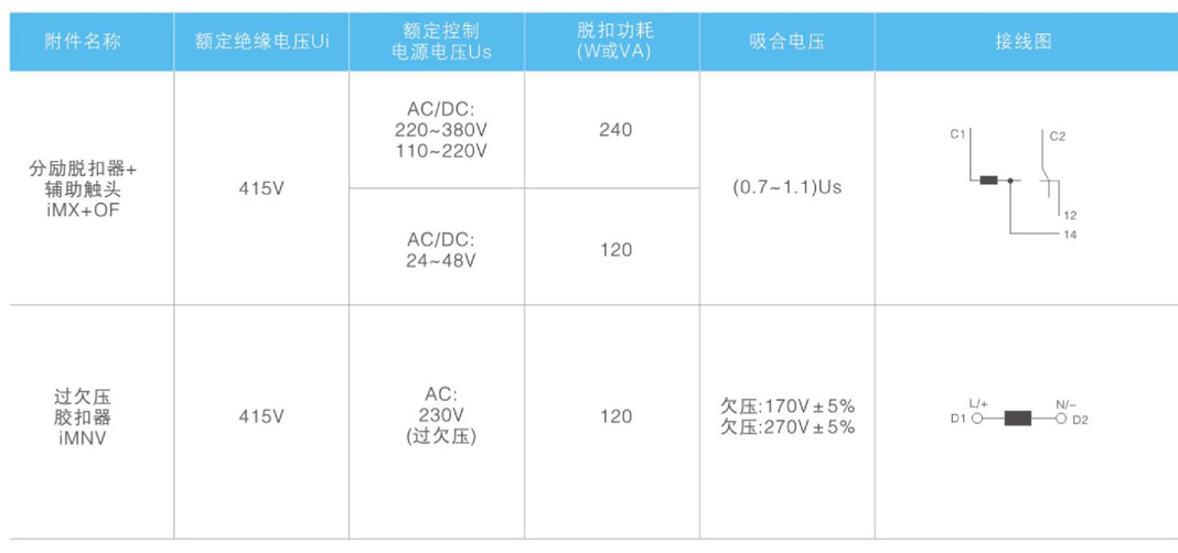 分励脱扣器、分励脱扣器+辅助开关及过欠压脱扣器的技术参数